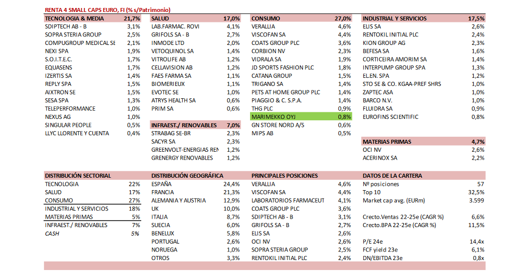 En diciembre hemos incluido la finlandesa Marimekko (retailer textil, market cap 500m EUR). Marimekko tiene una marca fuerte y única que goza de gran popularidad en Finlandia, y cada vez más en el extranjero. La estrategia de crecimiento de la empresa se basa en la expansión internacional, comercio electrónico, colaboraciones de marca y en atraer a un público más amplio, lo que debería apoyar el crecimiento orgánico, y, mediante la mejora de los volúmenes, llevar a una mejora de los márgenes. En 2018-22 ha tenido un CAGR de doble dígito en ventas y EBITDA. Sus objetivos financieros de largo plazo son crecimiento anual de las ventas c.15%, margen EBIT del 20% y DN/EBITDA <2x (caja neta actualmente). Con un ROCE> 35% y FCF/ventas >15%, cotiza a PER 24e de 19x.