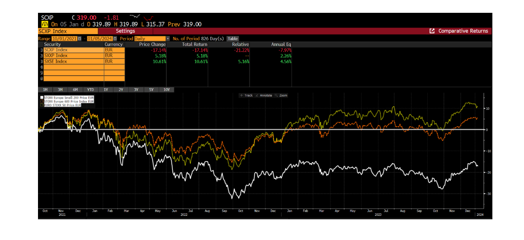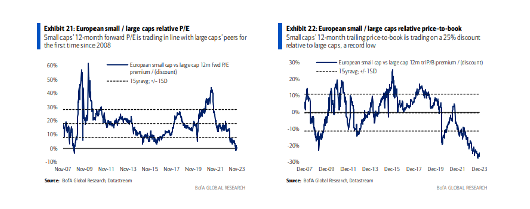 - Mayor crecimiento en resultados esperado. Para 2024 se espera un crecimiento del BPA del Stoxx Europe Small 200 del 12,5% (vs. +6% del Stoxx 600), y para 2025 del 14% (+9% Stoxx 600).