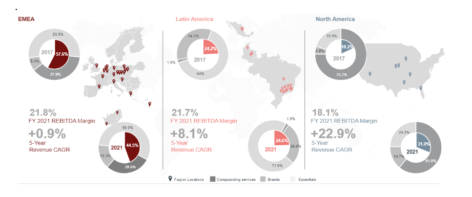 Fagron (Bélgica, mkt cap 1,2bn EUR, 1,7% s/NAV). Es líder mundial en preparados farmacéuticos (fórmulas magistrales), integrando toda la cadena de valor con sus tres divisiones (Essentials 50%, Brands 18% y Compounding services 32%). Bien diversificado geográficamente, ocupa una posición de liderazgo en 7 países y está entre los top-5 en la mayoría de los países en los que participa. Es un mercado nicho y defensivo (~1% del mercado farmacéutico global, que es un TAM de 1,2 tn usd), muy fragmentado y creciendo MSD (+6% CAGR 2021-26e), donde es fundamental tener escala e integrar la cadena de valor (estrategia de la compañía). Incrementar la proporción de compounding del 1,0% al 1,2% supondría aumentar el TAM en +20% (~2 bln usd adicionales hasta 12 bln usd). Con un buen track record de crecimiento (CAGR 17-21 +8%), rentabilidad (mg EBITDA >20%), conversión a caja (OPF / EBITDA >70%, con capex/ventas 3-3,5%), y M&A como palanca de crecimiento, cotiza PER 24e <15x y FCF yield 24e >7,0%, múltiplos que están un 15-20% por debajo de la media de 5 años. El crecimiento y visibilidad en resultados, junto a la expansión de múltiplos, nos hacen ser optimistas en la compañía.