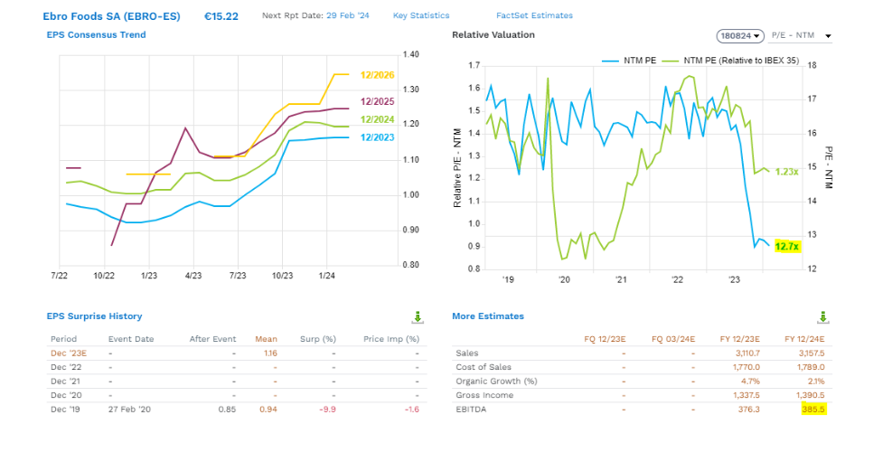 Ebro Foods (España, market cap 2,2bn EUR, alimentación). Líder mundial en el sector del arroz, con una cuota de mercado global de alrededor del 25%, y segundo fabricante mundial de pasta. Opera principalmente en el mundo occidental (el 92% de sus ingresos se generan en Europa y EE.UU.). Arroz supone un 80% de sus ventas (pasta 20%), con un foco creciente en productos de mayor valor añadido/conveniencia. Con un top line de bajo crecimiento, pero visible, el momento de resultados en 2024 mejora gracias a la previsible mejora en margen operativo, y una mejor conversión a FCF. CAGR 2022-25e: Ventas +3%, EBIT +8% y B.Neto +16%. (estimaciones Facset). Asumiendo un EBITDA 24e de 385m EUR EBITDA y FCF200m EUR, está cotizando EV/EBITDA 24e de 7,5x (descuento del 25% vs. media de largo plazo y comparables de c.10x), FCF yield >8%, PER 12,5x y dividend yield c.4.5%. Aplicando 14x EV/EBIT o FCF yield 6,5% a estimaciones 2024, llegaríamos a 20 EUR/acción (+30%).
