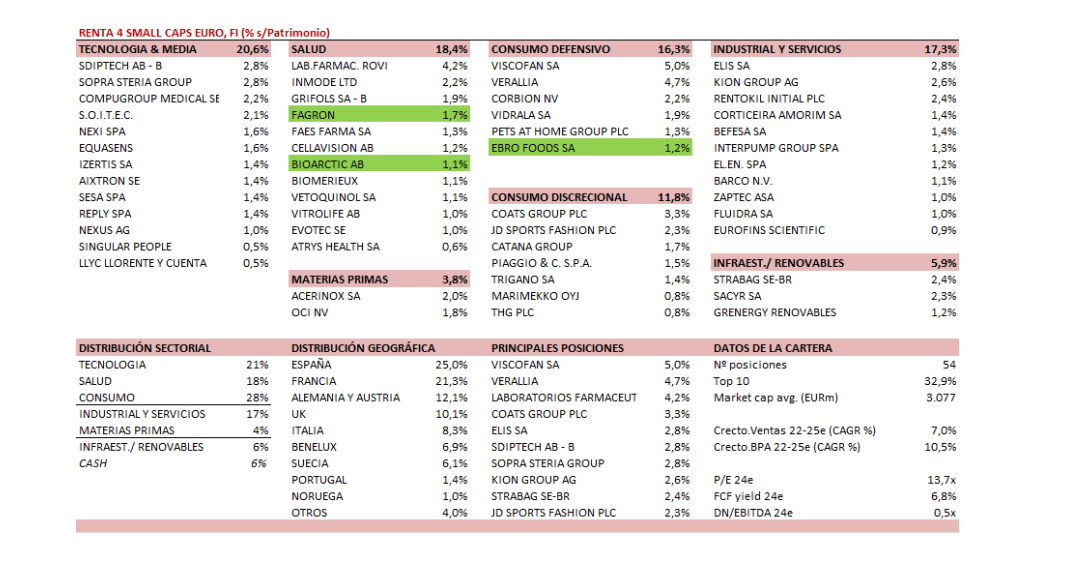 La cartera actual del Renta 4 Small Caps Euro está compuesta por 54 valores, con las primeras 10 posiciones representando un 33% del patrimonio. El posicionamiento de comienzo de año se mantiene fiel a la política y filosofía del fondo. Alrededor del 70% está en compañías de alta calidad y crecimiento visible, en los sectores salud, tecnología y consumo. Y el 30% restante en compañías donde vemos una infravaloración evidente, principalmente sectores industriales, servicios y materias primas.