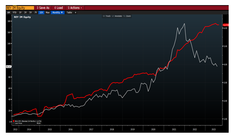 Respecto a movimientos, en julio hemos dado salida a Kahoot tras ser objeto de OPA (a 35 NOK/acc, rentabilidad en el año 2023 +79%). Hemos incorporado a Reply y Sesa, dos empresas de tecnologías de la información italianas, bien posicionadas en la megatendencia de la transformación digital, con visibilidad de ingresos, mejora operativa, buenos equipos directivos, caja neta y valoración razonable (múltiplos en mínimos de 5y), con un comportamiento discreto en los últimos 12 meses (-20%, a pesar de seguir creciendo en ingresos y beneficios).