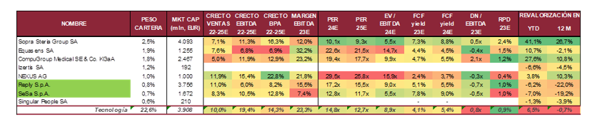 De esta forma aumentamos peso en un sector con crecimiento estructural, que hoy presenta valoraciones razonables, donde ya tenemos compañías con buen posicionamiento en sus mercados (Sopra Steria y Equasens en Francia, Compugroup y Nexus en Alemania, Singular People e Izertis en España).