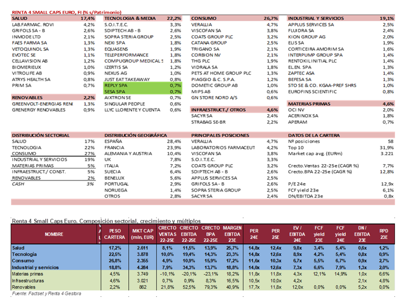 A pesar del buen comportamiento reciente, nuestra cartera sigue cotizando a múltiplos atractivos: 13x PER 24e con crecimiento en BPA 22-25 del 13%, FCF yield >6% y DN/EBITDA c.1x, y seguimos viendo un potencial significativo. El Renta 4 Small Caps Euro FI está compuesto por 58 valores, con las primeras 10 posiciones representando un 32% del patrimonio. El posicionamiento se mantiene fiel a la política y filosofía del fondo. Alrededor de 2/3 de la cartera está en los sectores salud, tecnología y consumo, en compañías de alta calidad y crecimiento visible. Y el 1/3 restante en sectores industriales, servicios, materias primas e infraestructuras, donde vemos una infravaloración evidente, en compañías de calidad, líderes en su segmento.