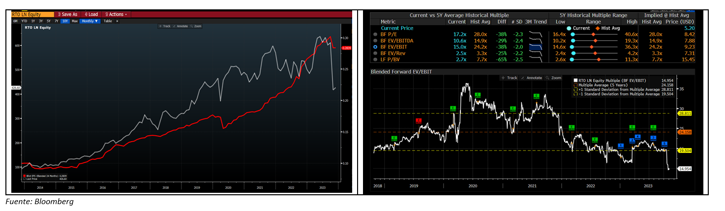 Hemos aumentado peso en Rentokil (2,6% s/NAV). Ha caído un 30% desde la publicación de resultados 3T23, debido a la preocupación por la integración de Terminix y la percepción de que el control de plagas en Estados Unidos sea más cíclico de lo percibido anteriormente. El consenso ha rebajado estimaciones de BPA 23-24e un 3-4% únicamente, con lo que la contracción del múltiplo ha sido drástica. El crecimiento orgánico en 3T23 fue del 4,3%, con el resto de los negocios evolucionando por encima de lo esperado (control de plagas en Europa y resto del mundo, Hygiene & Wellbeing). Creemos que los problemas son más cíclicos que estructurales, y que la integración de Terminix avanza según lo previsto. Cotiza a 16x PER 24e, EV/EBITDA 9x y FCFyield c.6%, creemos que la compañía vale 6,0-6,5 GBP/acc. (+45/+55% vs. actual).