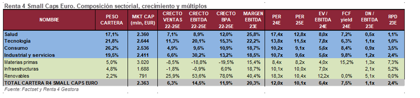 La cartera del R4 Small Caps Euro FI cotiza a 12x PER 24e con crecimiento en BPA 22-25e >10%, FCF yield 24e >7% y DN/EBITDA c1x. Seguimos viendo un potencial significativo, del 42% según valores teóricos de consenso y c.60% según nuestra valoración interna. Está compuesta por 58 valores, con las primeras 10 posiciones representando un 33% del patrimonio.