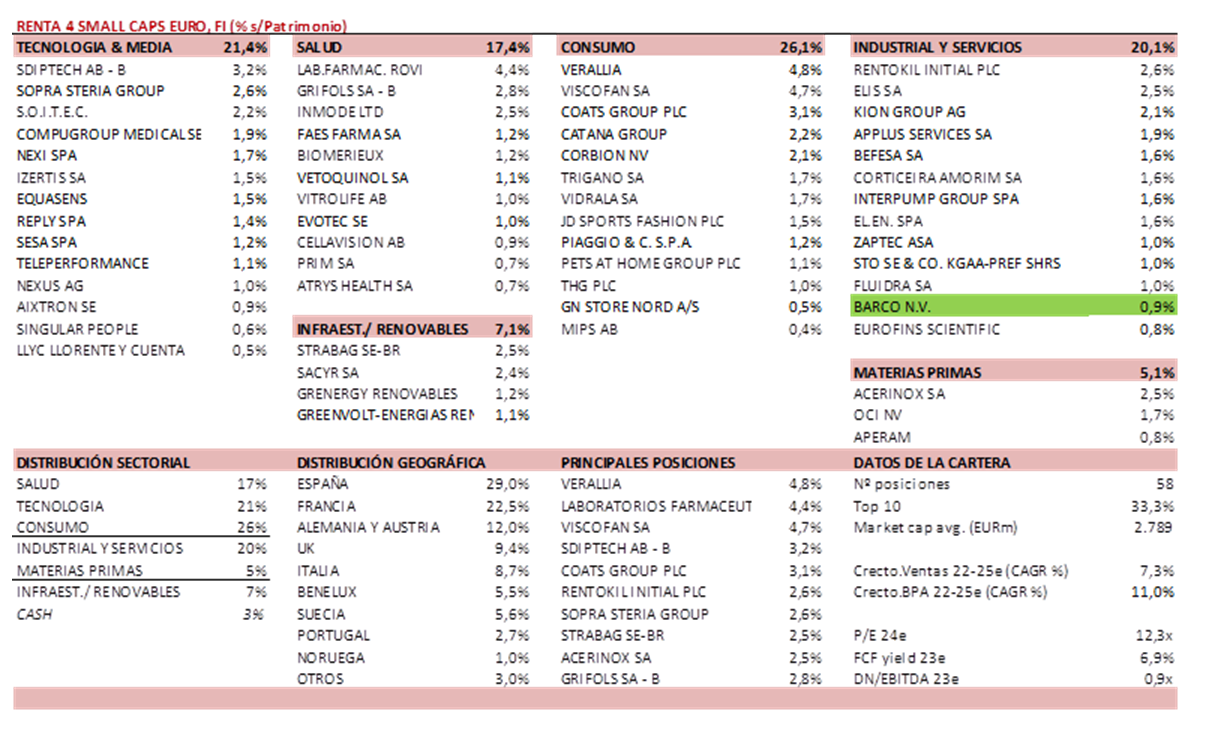 Barco (0,9% s/NAV) es una compañía belga, líder global en soluciones de visualización. Opera a través de 3 nichos: entretenimiento, empresa y sanidad. 1) entretenimiento (38% de las ventas) se centra en el suministro de soluciones de proyección, iluminación, LED y software para mercados profesionales como el cine, la hostelería, el comercio minorista y la publicidad, 2) enterprise (29%) está presente tanto en el mercado corporativo como en el de salas de control y ofrece soluciones de visualización con videowalls, proyectores corporativos en combinación con software de colaboración, redes y capacidades de conectividad (su producto más conocido es Clickshare). 3) Healthcare (33%) ofrece pantallas para el diagnóstico y la modalidad de imagen en el campo de la radiología, mamografía, cirugía y odontología, junto con soluciones digitales en red para quirófano. Barco ha caído un 50% desde los máximos de abril, creemos que el mercado ha sobredescontado el momento negativo en China y nicho empresarial, sin que haya grandes cambios estructurales. Tiene caja neta (supone el 20% del market cap actual), mg EBITDA c.15%, ROCE c.20% y cotiza a >8% FCF yield 24e y 7,5x EV/EBITDA 24e (15-20% por debajo de su media 10y).